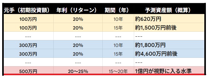 元手100万円からでも億り人は理論上は可能ですが、現実的に狙うなら【300万〜500万円+年利20〜30%を10年以上】が1つの目安になります。