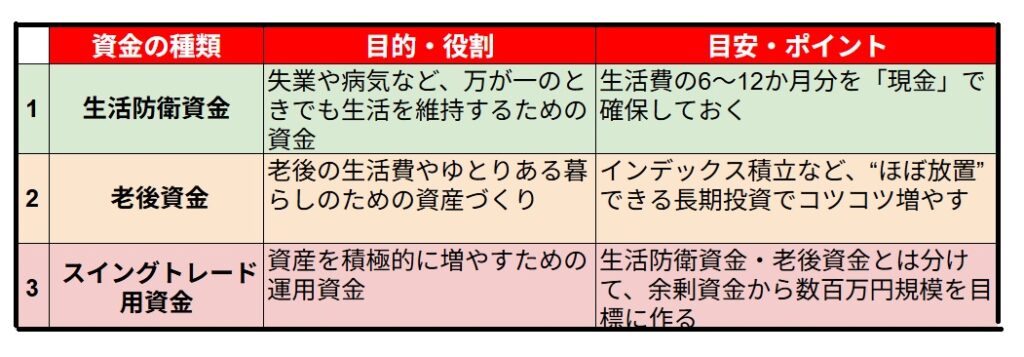 • 投資資金:生活防衛資金とは別枠の“最悪ゼロになっても生活が破綻しないお金”